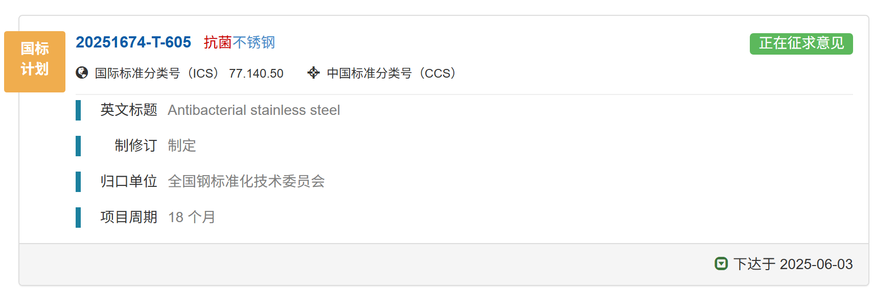 國家標準《抗菌不銹鋼》正在征求意見中,歡迎報名成為參編單位并提出修改意見和建議。01 國家標準計劃《抗菌不銹鋼》已下達國家標準計劃《
